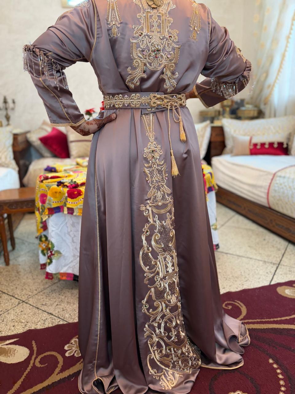 Ce caftan de couleur terre évoque la chaleur et l'élégance de la nature. Confectionné dans un tissu léger et fluide, il épouse délicatement les formes du corps tout en offrant une aisance incomparable. Sa teinte, un doux marron chaud, rappelle les nuances de la terre, apportant une touche intemporelle et raffinée. Les broderies, réalisées à la main avec une précision remarquable.